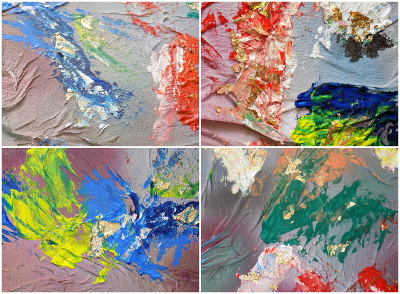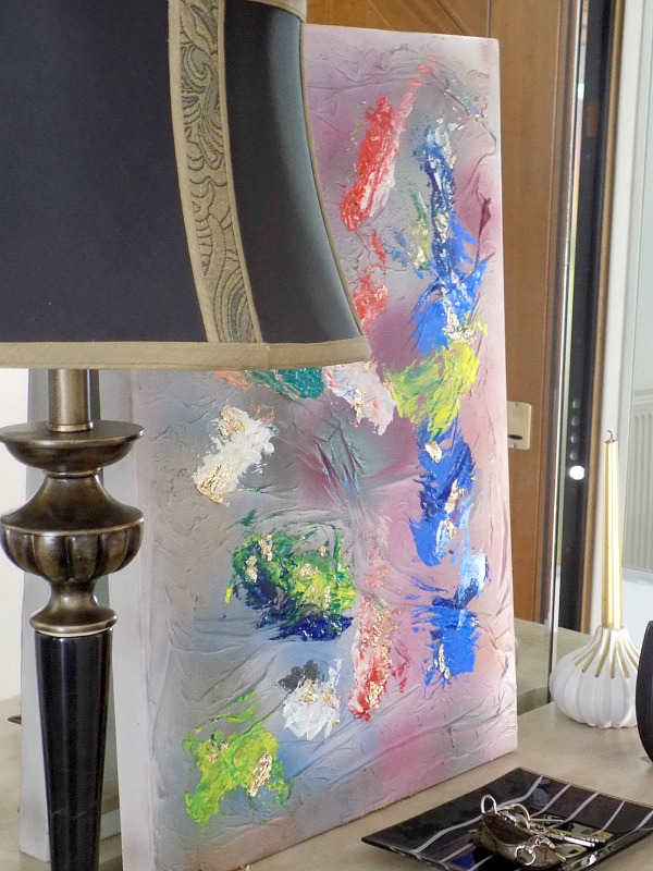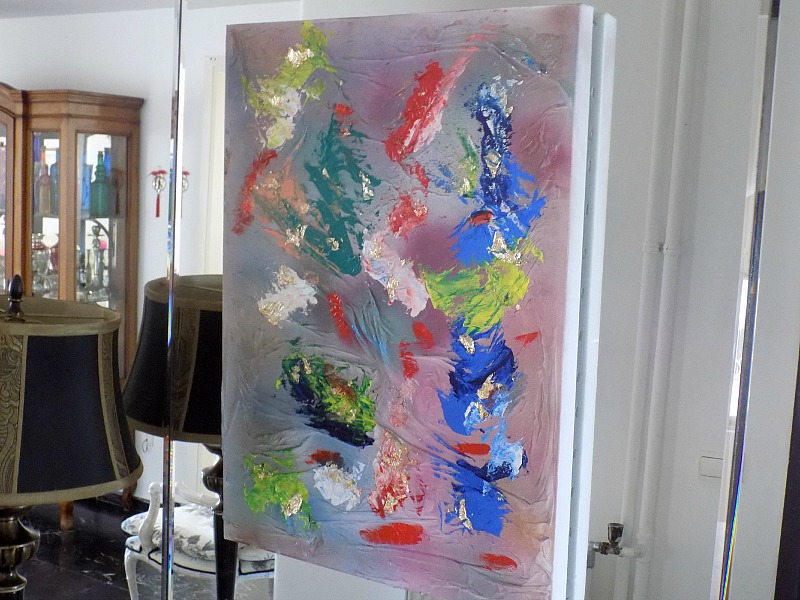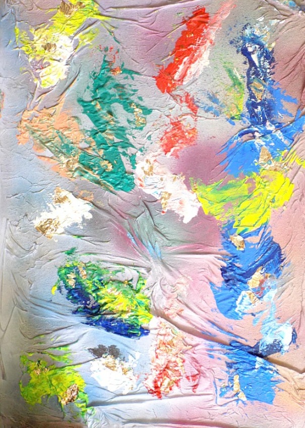 Χρώματα ανακατεμένα με ένα μόνο χαρακτηριστικό. Να είναι έντονα και κομματάκια από φύλλα χρυσού. Τα έστρωσα πάνω στον καμβά μαζί με το χρωματισμένο με σπρέι γκοφρέ χαρτί.