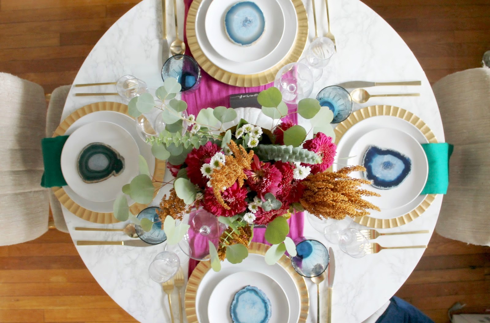 Με εντυπωσίασε ιδιαίτερα η ροτόντα με τους μπλε αχάτες πάνω στα πιάτα!!! Εκτυφλωτικό χρώμα!!! (και η ανθοδέσμη είναι τέλεια!)