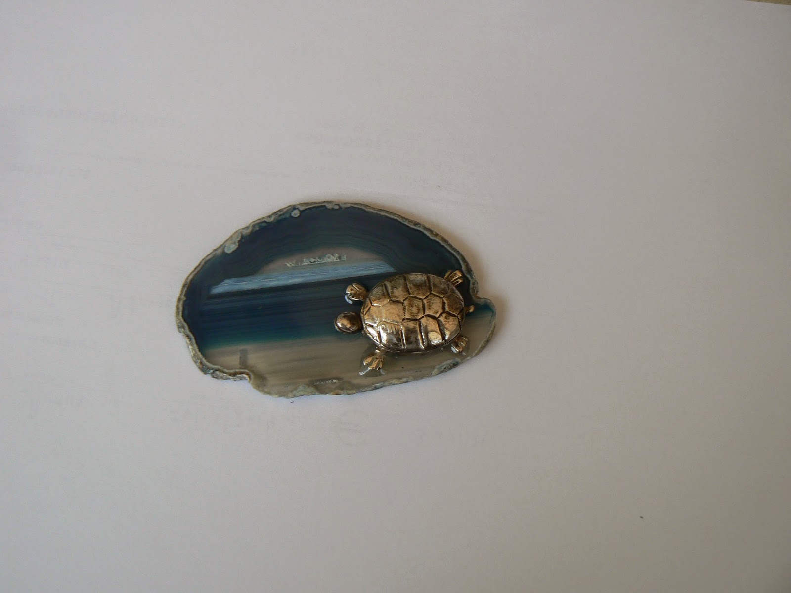 Το συζήτησα κάποια στιγμή με τον ανηψιό μου και φίλο μου κ. Δούλα που διατηρεί Εργαστήριο Χρυσοχοίας στο κέντρο της Αθήνας και την επόμενη μου τηλεφώνησε πως έχει ένα δώρο για μένα. Το δώρο ήταν φύλλα χρυσού, ασημιού και μπρούτζου σε υγρή μορφή μαζί με το ανάλογο βερνίκι. Ο ίδιος μου έχει κάνει κατά καιρούς διάφορα δώρα μεταξύ των οποίων ήταν κι αυτός ο αχάτης με μια ασημένια χελώνα πάνω.