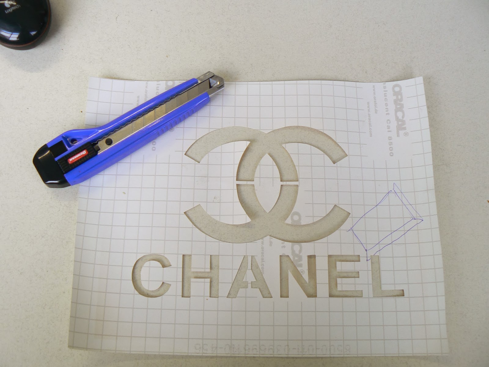 Όση ώρα ο δίσκος στέγνωνε εκτύπωσα σ ένα χοντρό αυτοκόλλητο το logo της Chanel και το έκοψα σαν στένσιλ.