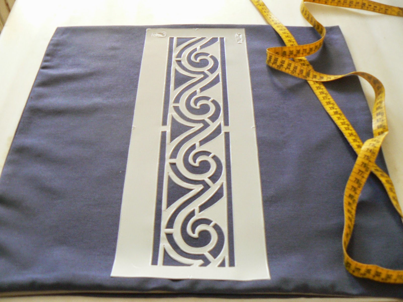 Δεν μου άρεσαν καθόλου έτσι μονόχρωμες που ήταν κι έτσι αποφάσισα να τους προσθέσω λίγη λάμψη.  Αφού τις σιδέρωσα τις ζωγράφισα με ένα στένσιλ που είχα αγοράσει παλιότερα.