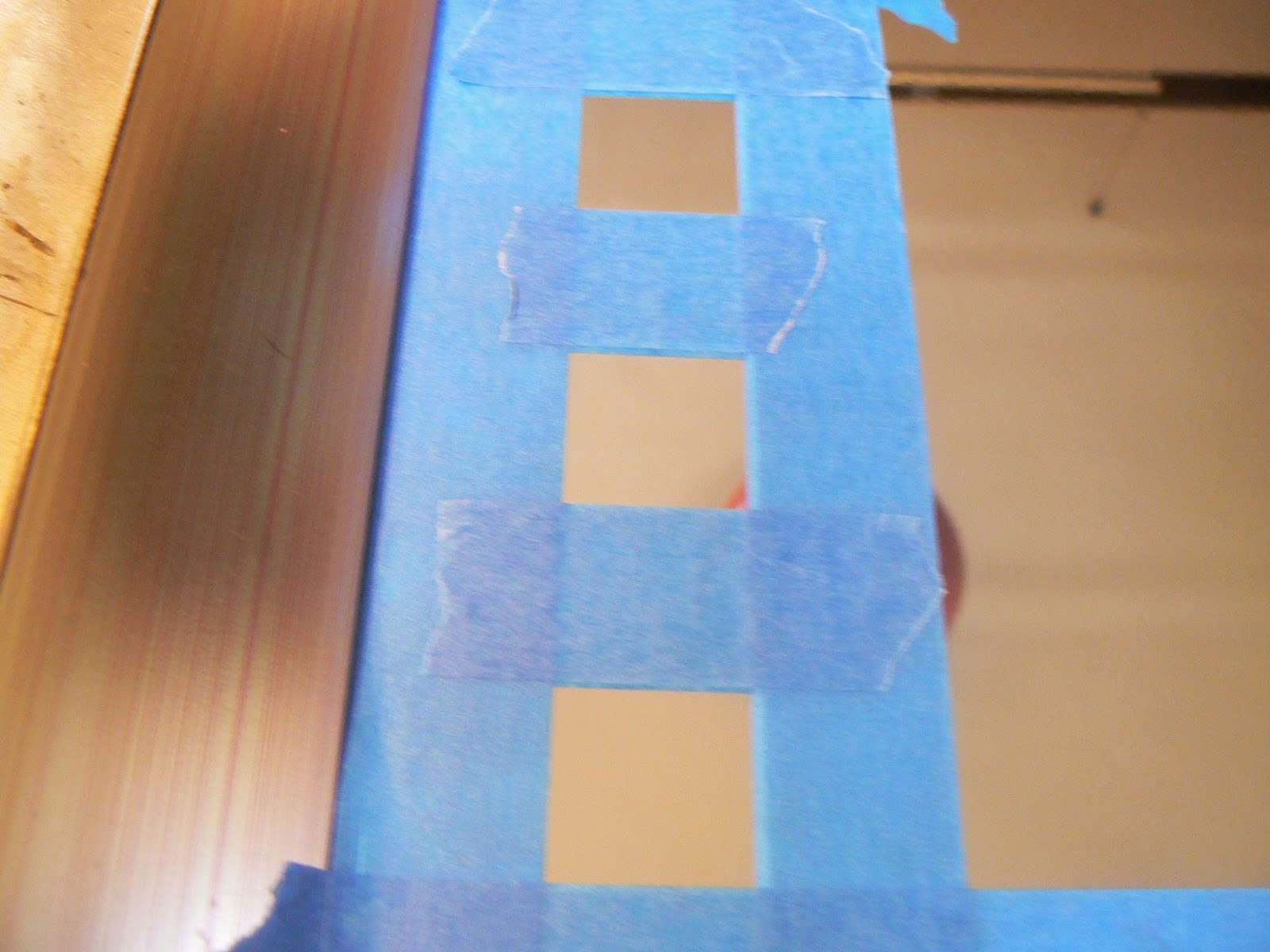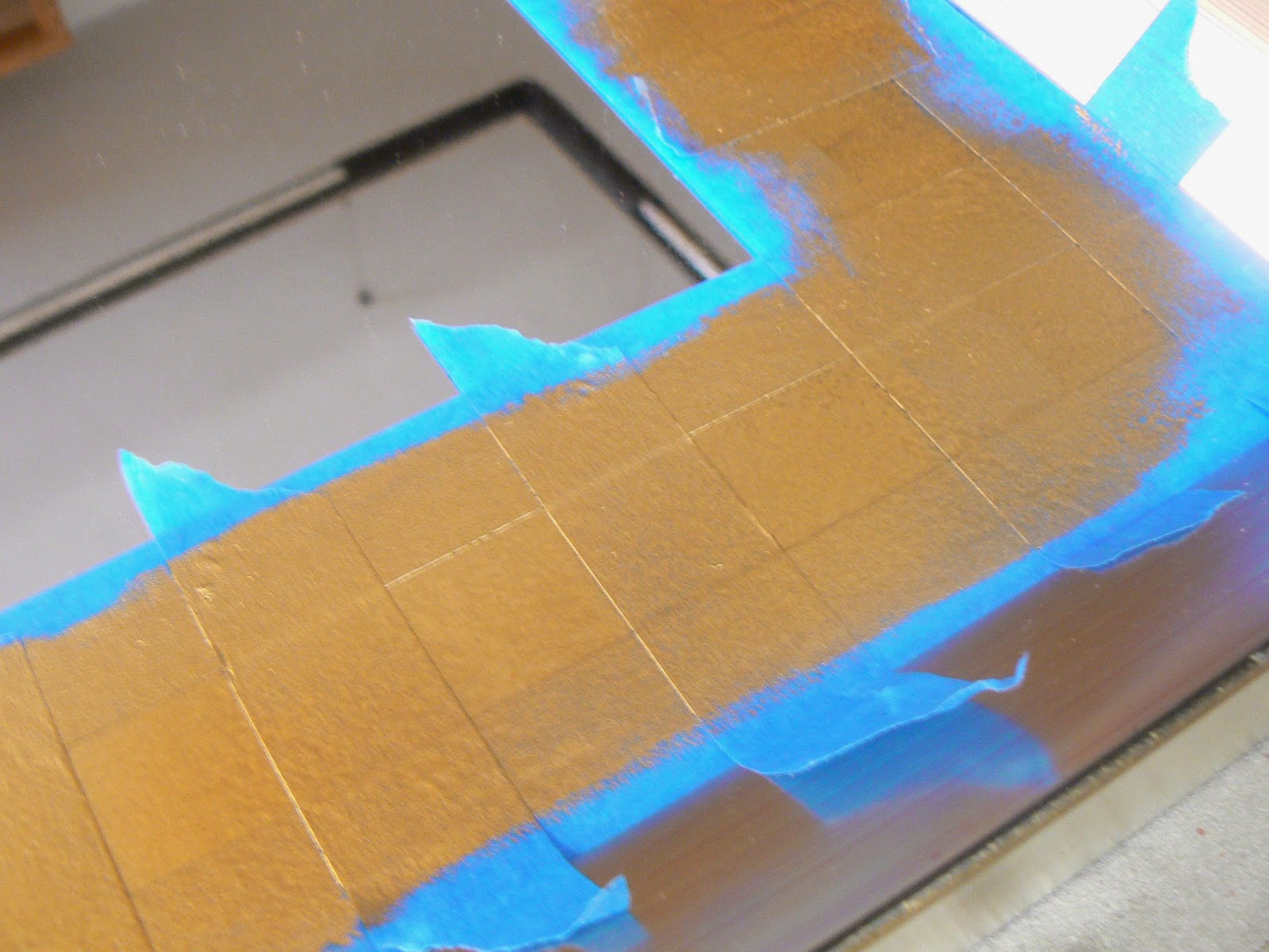 Στη συνέχεια με μια μπογιά που κάνει για γυαλιστερές επιφάνειες όπως τζάμια, καθρέφτες, πλαστικά, σε μπρονζέ χρώμα πέρασα με ένα ρολάκι τα τετράγωνα που είχαν σχηματιστεί.