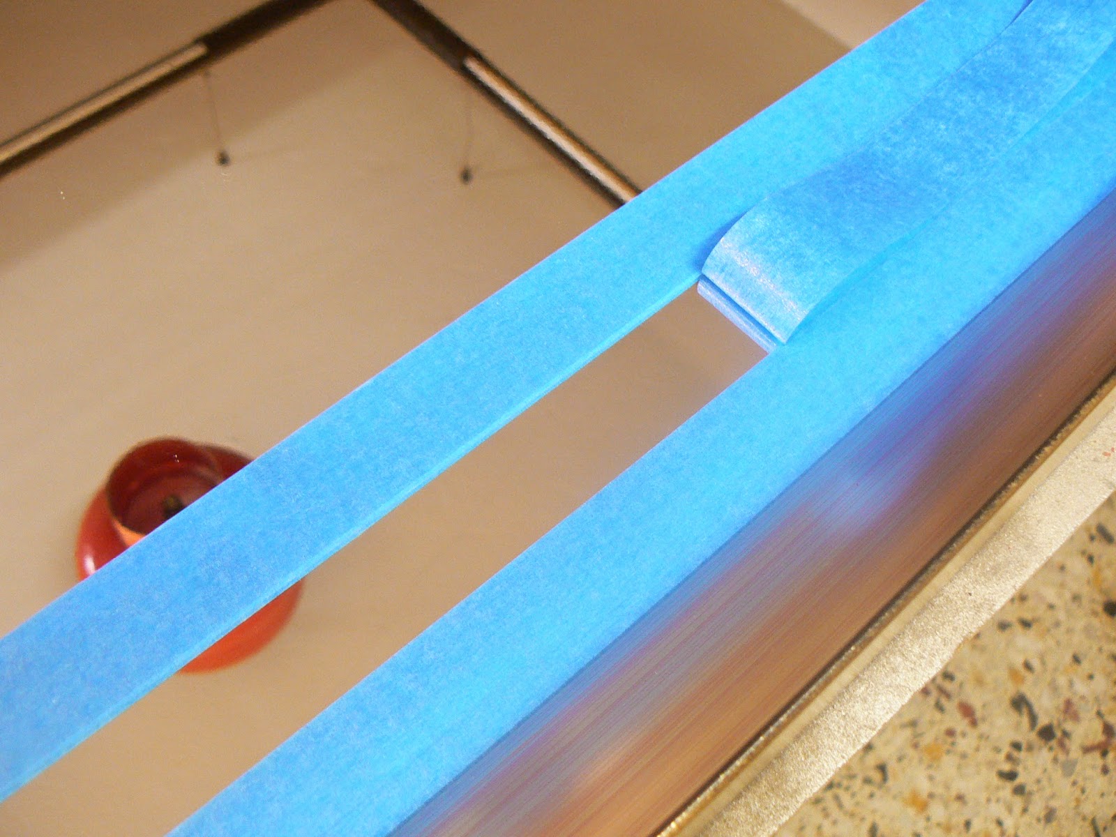 Μόλις πέρασαν 2 ώρες και είχε στεγνώσει το χρώμα ξεκίνησα να φτιάξω «κάτι» στην επιφάνεια του καθρέφτη. Με την βοήθεια μπλε ταινίας έφτιαξα περιμετρικά του καθρέφτη ένα πλαίσιο-γραμμή αλλά αμέσως σκέφτηκα πως εντάξει μια γραμμή είναι. Ας φτιάξω κάτι πιο ενδιαφέρον!