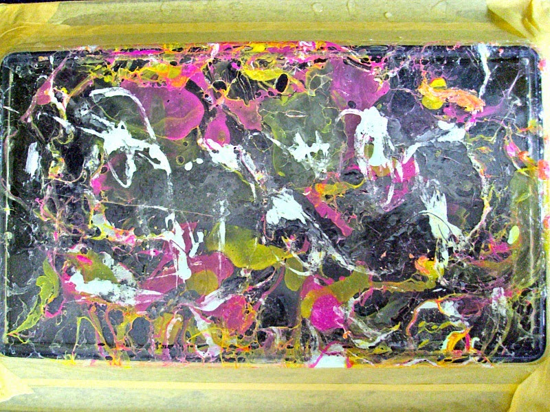 Τα ανακάτεψα με την οδοντογλυφίδα να ανακατευτούν τα χρώματα και βύθισα το κάτω μέρος του δίσκου στο νερό ίσα-ίσα να ακουμπήσει στην επιφάνεια που ήταν τα βερνίκια.