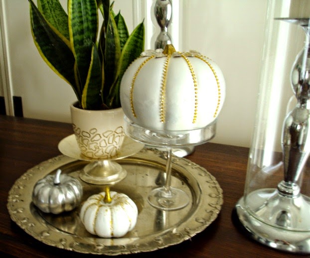 Σε μια γωνιά του μπουφέ δύο ψηλά κηροπήγια, ο δίσκος της γιαγιάς, το κασπό που είχα ζωγραφήσει στην ανάρτηση 2+1 γρήγορα DIY για να ομορφύνεις το σπίτι σου και οι κολοκύθες της Σταχτοπούτας