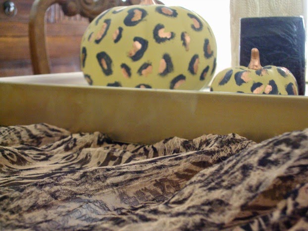 Fall tour dining room, silk animal print scarf, fall pumpkins