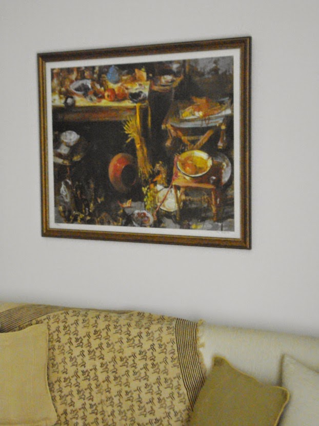 Πάνω από τον καναπέ υπάρχει μια μεταξοτυπία με θέμα και χρώμα φθινοπωρινό.