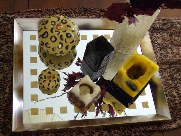 Πάνω του κάθισε ο ο διακοσμητικός δίσκος καθρέφτης  , οι animal print κολοκύθες , κεριά κι ένα βάζο που μιμείται πουλόβερ.