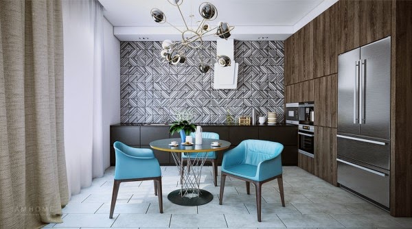 μια γωνία του σαλονιού έχει τοποθετηθεί η τραπεζαρία και η κουζίνα. Μεγάλη αίσθηση προκαλούν οι τυρκουάζ καρέκλες