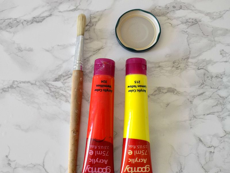 Δύο ακρυλικά χρώματα, κόκκινο και κίτρινο, ένα κάπως φαρδύ πινέλο και ένα καπάκι για αρχή ήταν ότι χρειαζόμουν.  Ε φυσικά και μία σκάλα γιατί όπως είπα ούτε καν μπήκα στο κόπο να κατεβάσω το φωτιστικό από το ταβάνι.