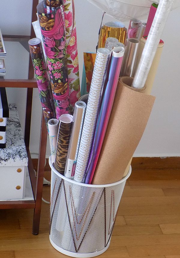 Καλάθι για χαρτιά περιτυλίγματος, μεταμορφώνοντας ένα καλάθι αχρήστων σε ένα όμορφο καλάθι για να αποθηκέυουμε τα ρολλά περιτυλίγματος.