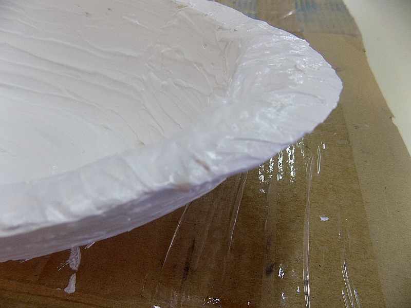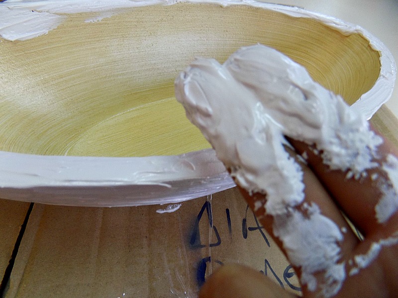 Ξεκίνησα λοιπόν να αλείφω την επιφάνεια του μπολ, μέσα έξω με τον στόκο. Δεν χρησιμοποίησα σπάτουλα, το έκανα με το χέρι, γιατί δεν ήθελα λείες επιφάνειες, έπρεπε είπαμε να έχουν κάποια υφή, κάτι που να θυμίζει ξύλο.